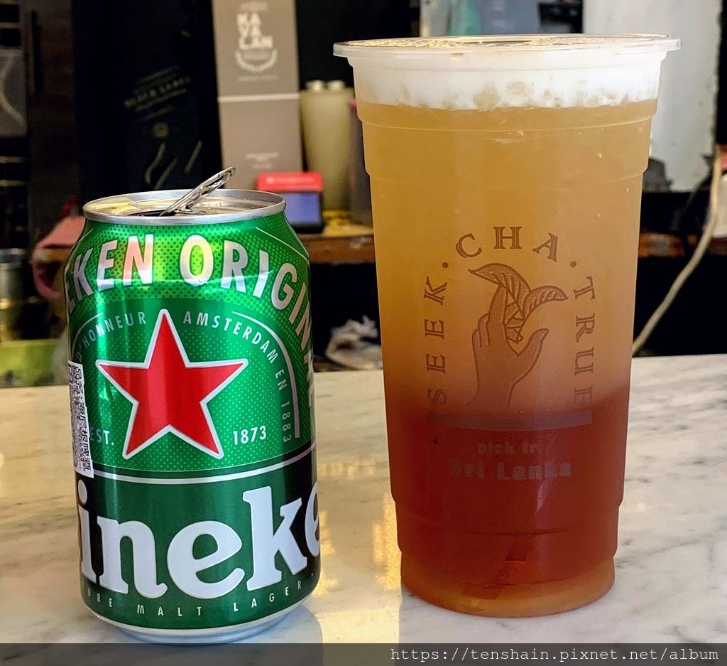 可惜我和老婆都是聞酒便醉的肉腳,只好請老闆手下留情,用海尼根啤酒,幫我們特調一杯最淡的啤酒花紅茶。因為晚點還要開車回台北,喝酒不開車,所以我請老婆幫我試喝看看。據說喝起來除了有啤酒的麥香,還有一點像氣泡水的感覺,特別清涼。我則點了一杯喜茶村紅茶,完全沒有酒精,只有單純斯里蘭卡紅茶的香甜。