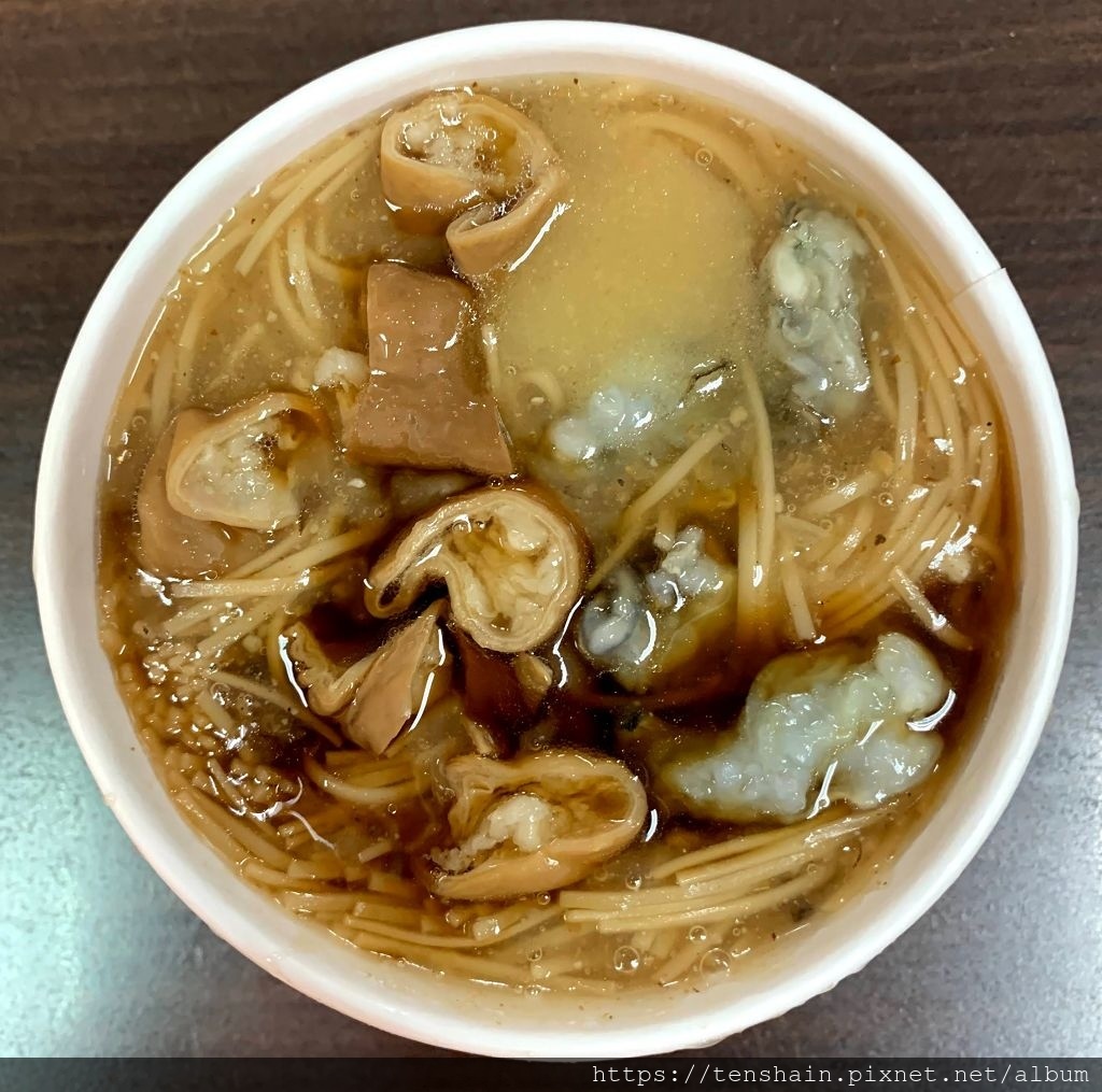 我們叫的是綜合麵線,小碗的50元,大腸+蚵仔一次加好加滿,我負責吃蚵仔,老婆負責大腸,分進合擊,很快就消滅了這碗萬惡的美食。蚵仔吃起來有點像蚵乾的口味,沒有腥味,蠻好吃的。據老婆說,大腸也煮得蠻爛的,容易入口,口味不錯。至於主角麵線糊,不是很濃的勾芡,加入的一小撮蒜泥和黑醋起了提味的功能,讓麵線吃起來口感層次更豐富,好吃。