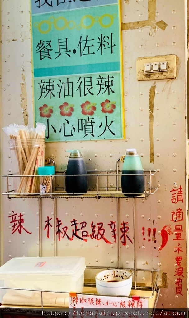放餐具佐料的地方,有特別的警語:辣椒超級辣!不是太能吃辣的人,最好敬而遠之。喜吃辣的人,最好也是先加一點點吃看看,若是能夠輕鬆駕馭,再酌量增加,千萬別逞強,一大匙就給它豪$的放下去,到時辣到不知今夕是何夕,那就不好了。