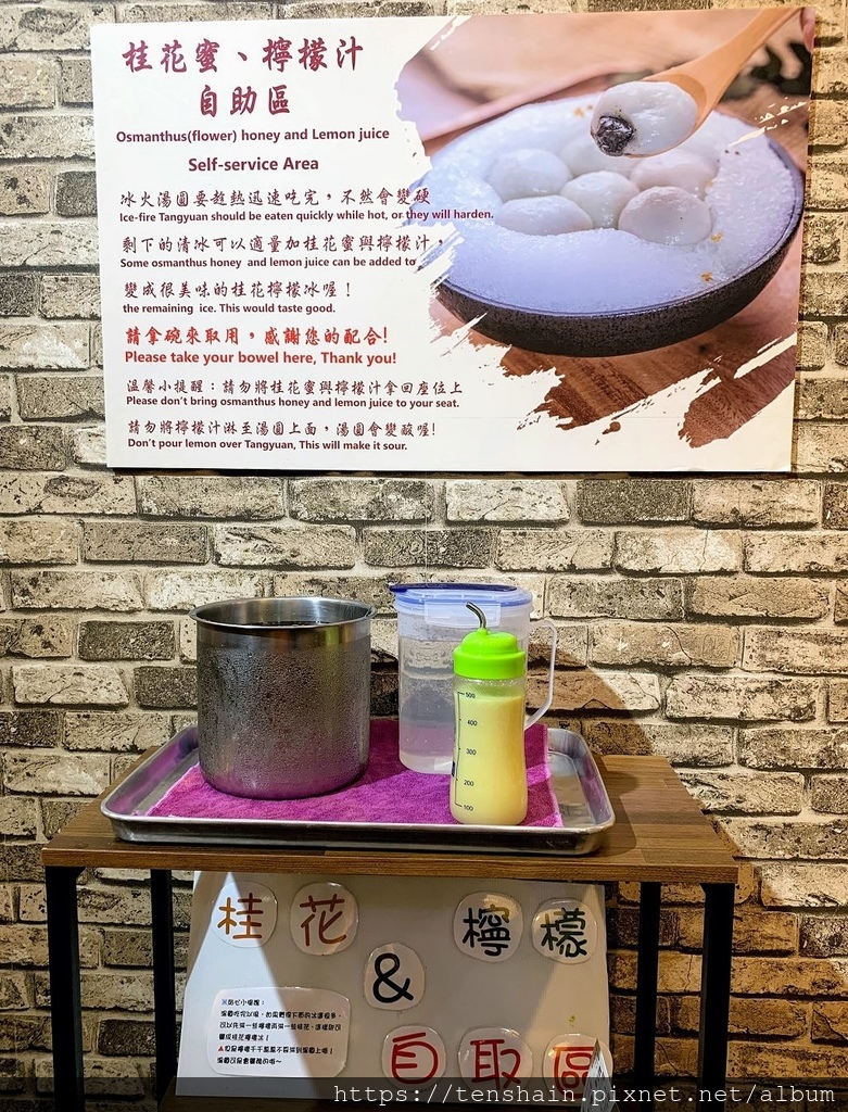 吃御品元冰火湯圓的第二個訣竅就是吃完湯圓後,拿著你的冰碗到「桂花蜜、檸檬汁自助區」,自己加桂花蜜、檸檬汁。因為原本端上桌的冰裡,雖然都有加桂花蜜和檸檬汁,吃起來已經有淡淡的桂花香和檸檬的酸味,但是,相信我,自己多加兩匙桂花蜜,再擠一些檸檬原汁後,把冰攪勻,酸酸甜甜的滋味會更上幾層樓,讓你不斷直呼:「好好吃!」