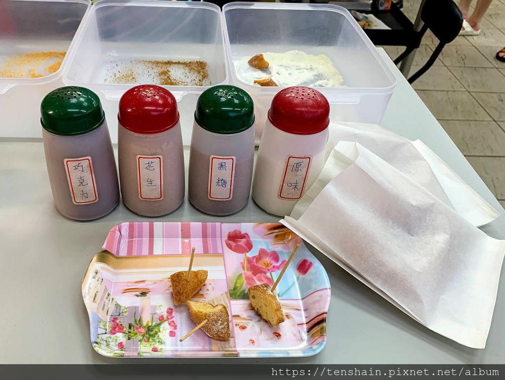 炸好的呼嚕呼嚕小米甜甜圈,可以灑上不同的粉來增添風味,有巧克力、花生、黑糖、原味(就是白糖粉)四種選擇。