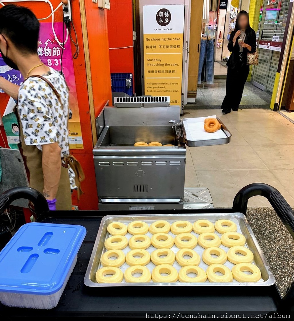 站在攤位旁,看著圓環狀的麵糰,在熱油中慢慢膨脹,變成亮晶晶、圓滾滾的甜甜圈,有一種療癒的感覺。