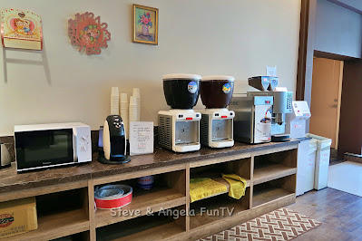 台中香榭驪舍大飯店/ 台中豐禾行旅的大廳後方為一個隔開的公共空間,這裡有公共廁所、交誼廳、以及24小時免費的飲料/咖啡吧台,吧台除了有冷飲之外,還有附有鮮奶奶泡的咖啡機!台中香榭驪舍大飯店/ 台中豐禾行旅的咖啡機使用鮮奶,真的很佛心!