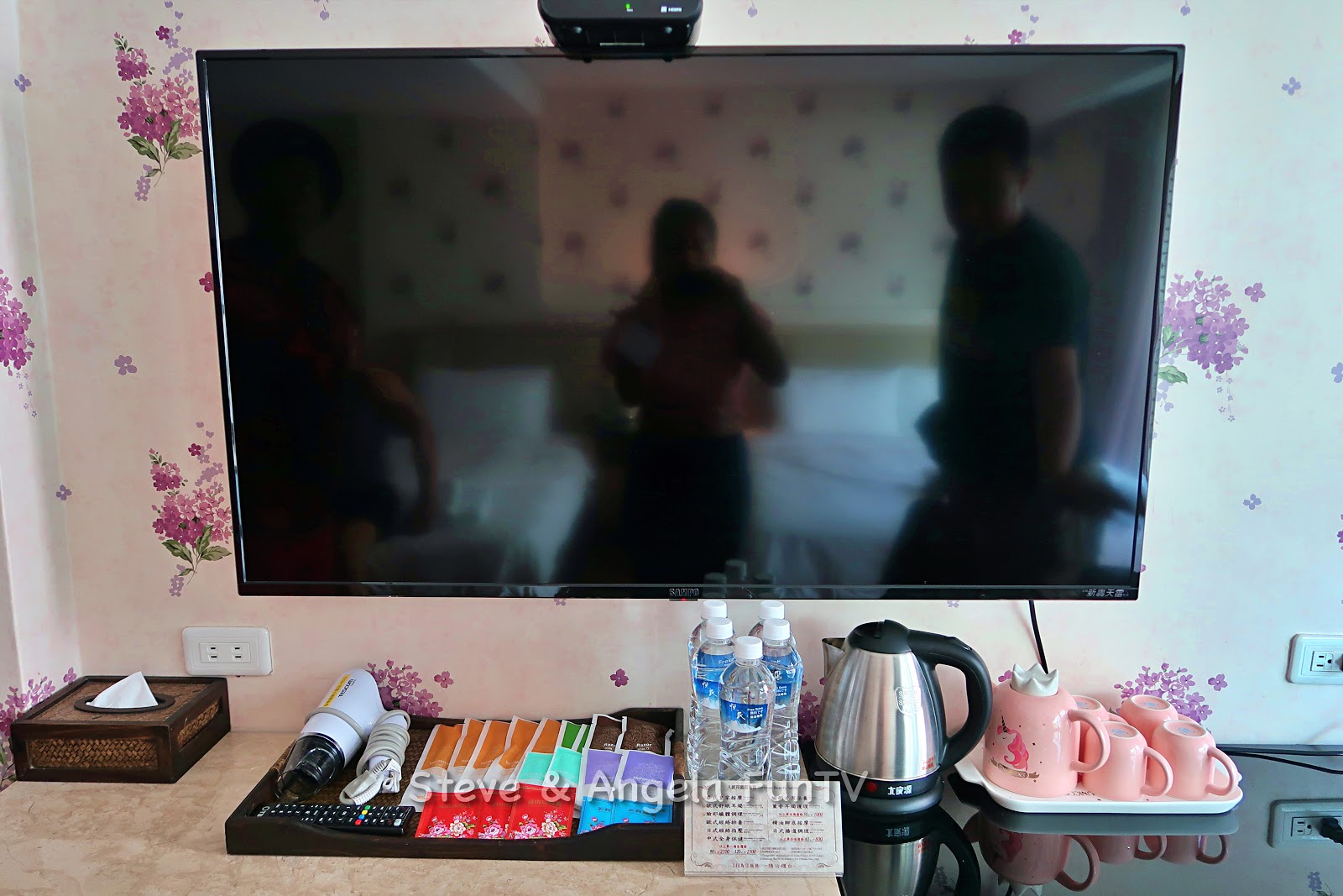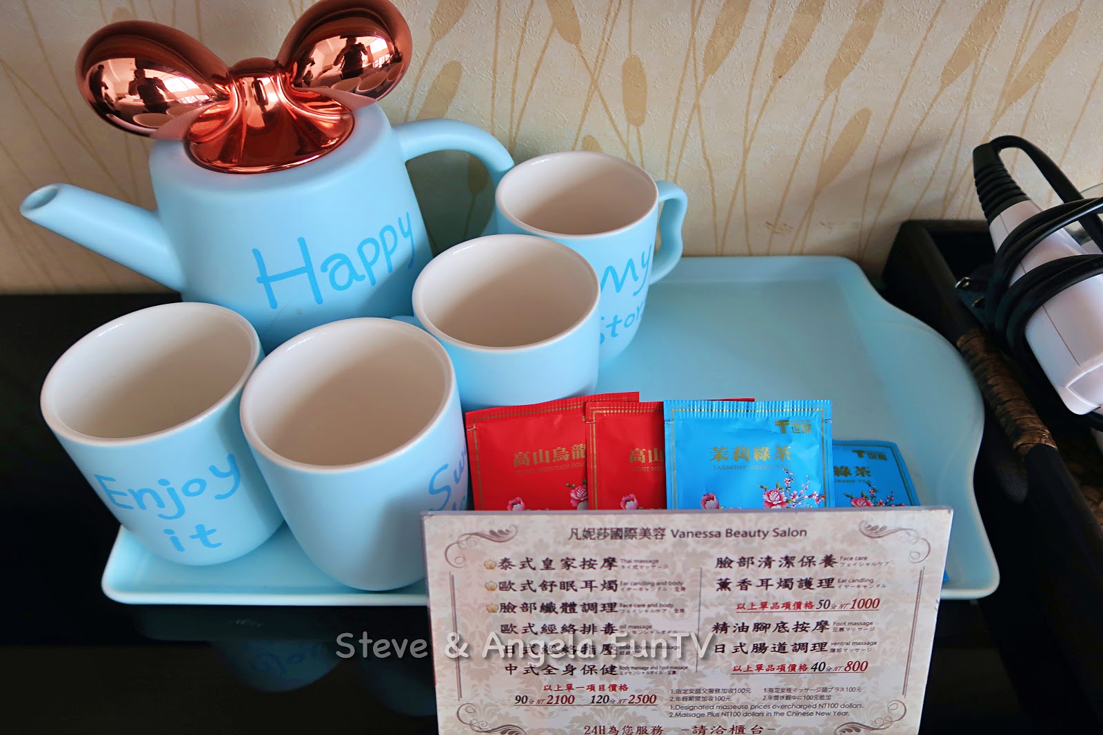 電視下的桌子有一組好可愛的茶杯組,每一個房間的茶杯組都不一樣喔!