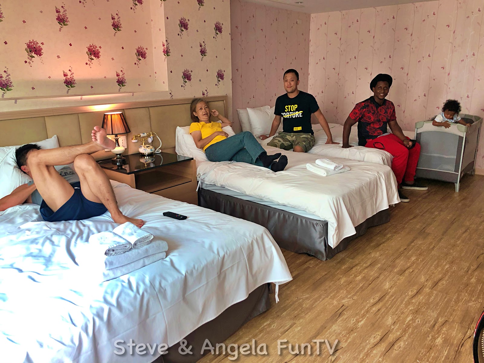 我們一路從高雄開車到台中,逛了一整天的台中,大家進到房間都累了,大家各自找自己的地方休息,台中香榭驪舍大飯店/ 台中豐禾行旅的五人房空間超級大,放了三張床和嬰兒床,再加上我們一行人的行李,也不覺得擁擠。