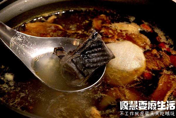 麻油燒酒烏骨雞鍋 +150元,先用麻油與薑爆炒,後續加入整罐米酒與裊裊的特製湯頭燉煮。
