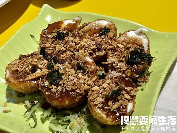 泰國女婿蛋佐羅望子醬 98元,水煮蛋炸過後在上方放上泰國特有的香料,這個非常適合當下酒菜。
