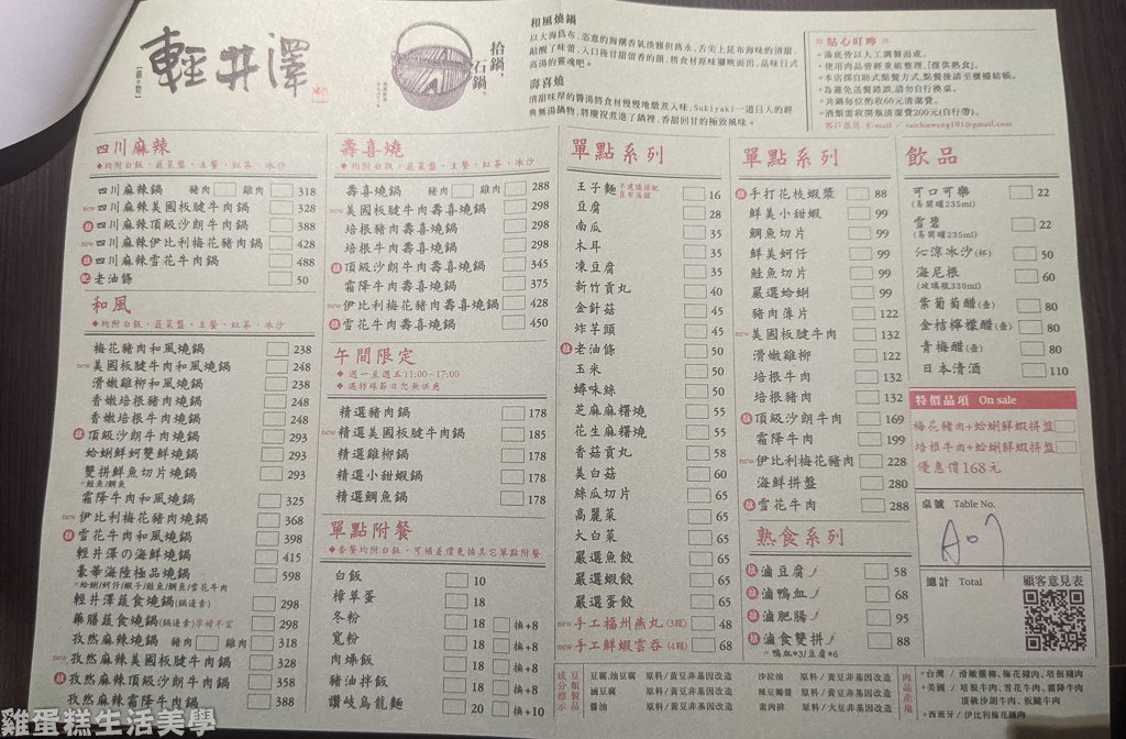 ▲菜單:火鍋總類有比較重口味的四川麻辣、壽喜燒、清淡的和風,還有一些單點的火鍋料和飲料。