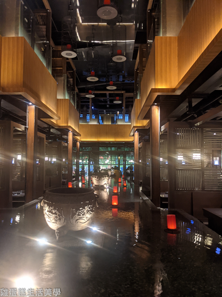 ▲餐廳的中央有個長型的水池,上面擺了幾個超大的鼎,這些造景是餐廳最大的亮點之一,有讓人穿越時空回到古代的錯覺,氛圍相當好。