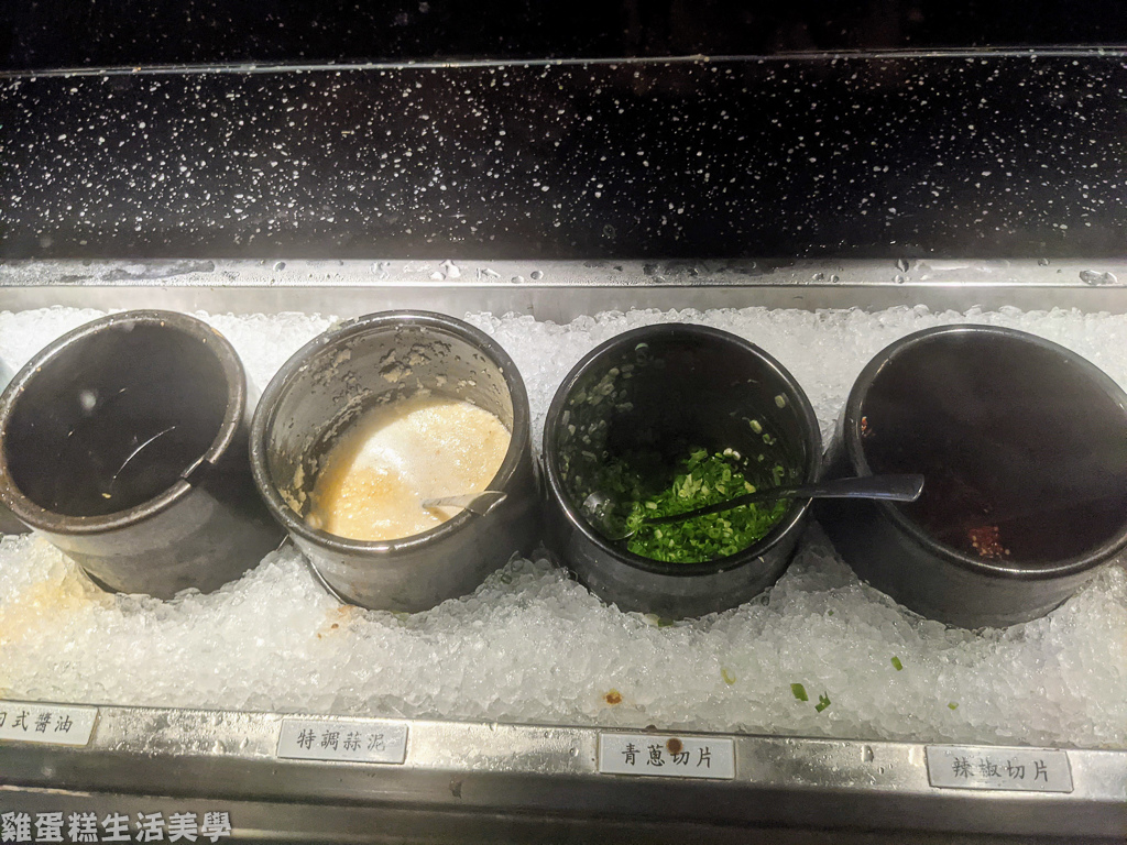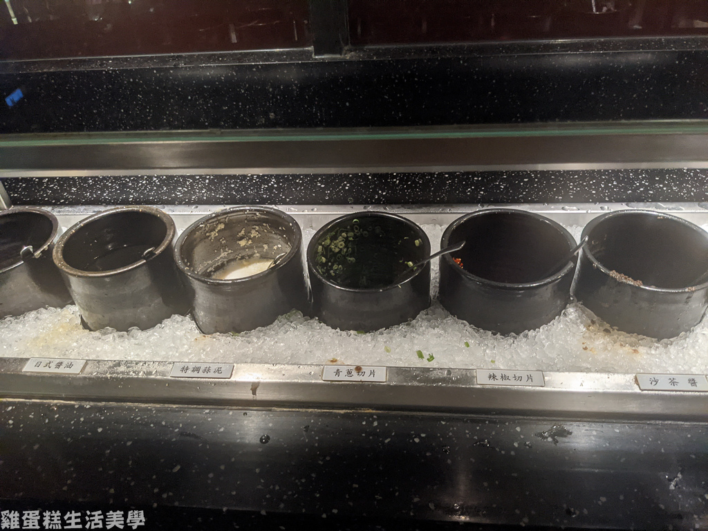 ▲醬料區有沙茶醬、釀造果醋、日式醬油、特調蒜泥、青蔥切片、辣叔切片、白蘿蔔泥。