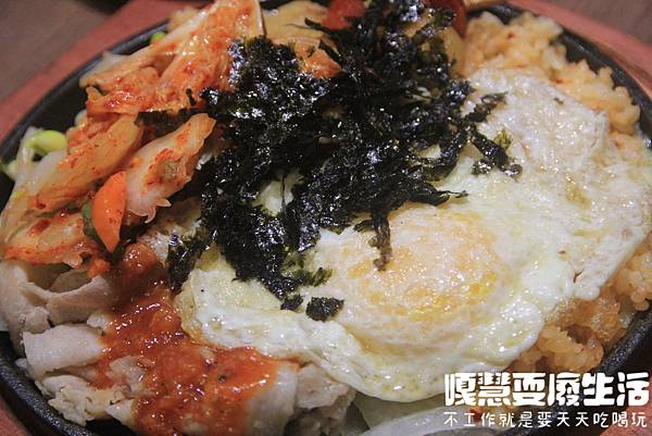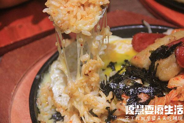 起司泡菜炒飯 140元 有半熟蛋、豬肉、韓式海苔、豆芽菜、泡菜、串物。下方鋪著滿滿的起司,剛上桌時有淡淡的麻油風味。