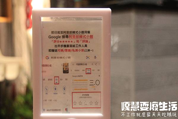 來阿里郎韓式小館有特別的活動,在google評論5顆星星。可以贈送可樂/雪碧/私房小菜(三擇一)
