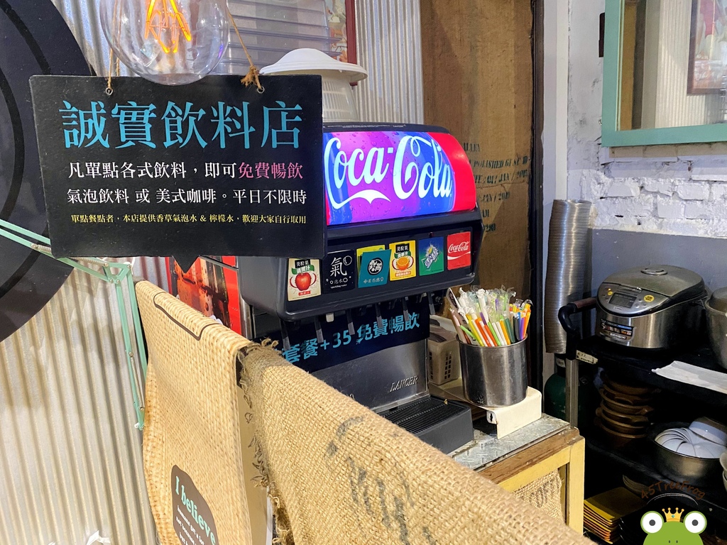 ▾ 門口有一個大大的看板寫著「餐點皆附飲料,只要加價$35可免費續飲」