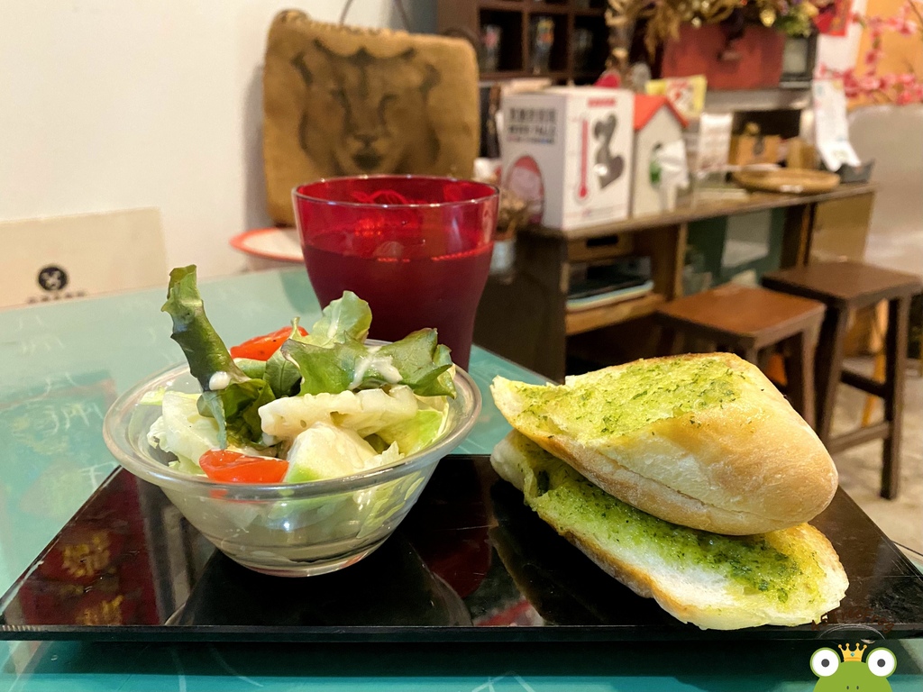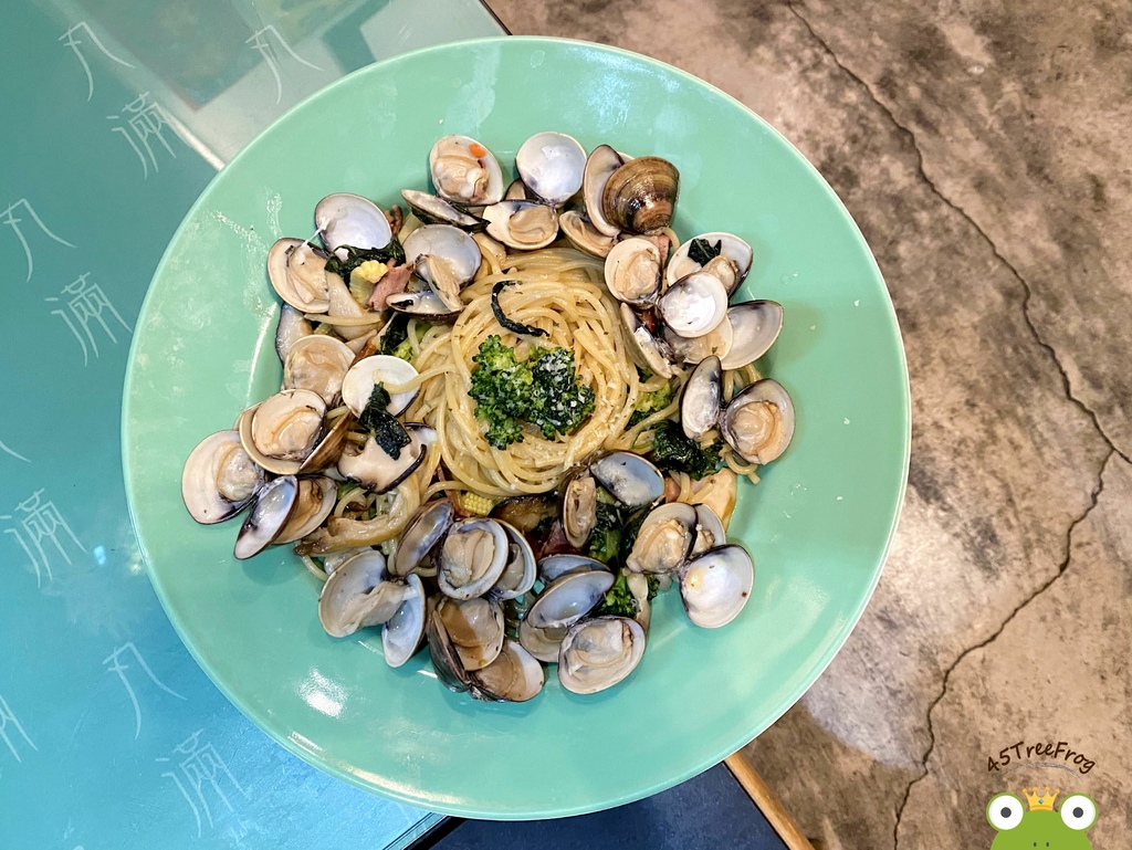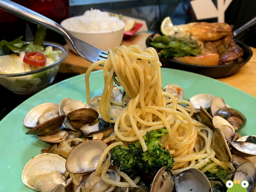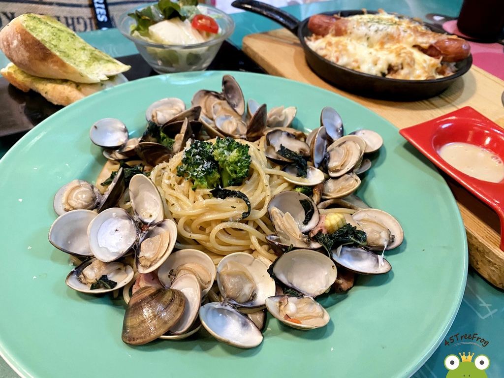 是招牌推薦品項之一,單純清炒最能吃得出食材的原味。而店家超大器,蛤蠣份量給超多,約莫有20顆。麵體吸附了滿滿的蛤蠣鮮味,另外還有一些培根跟時蔬做陪襯。整體來說因為海鮮味蠻濃鹹,讓口味偏重一些。但隨餐附的的沙拉、紅茶與麵包可以解一下油膩。