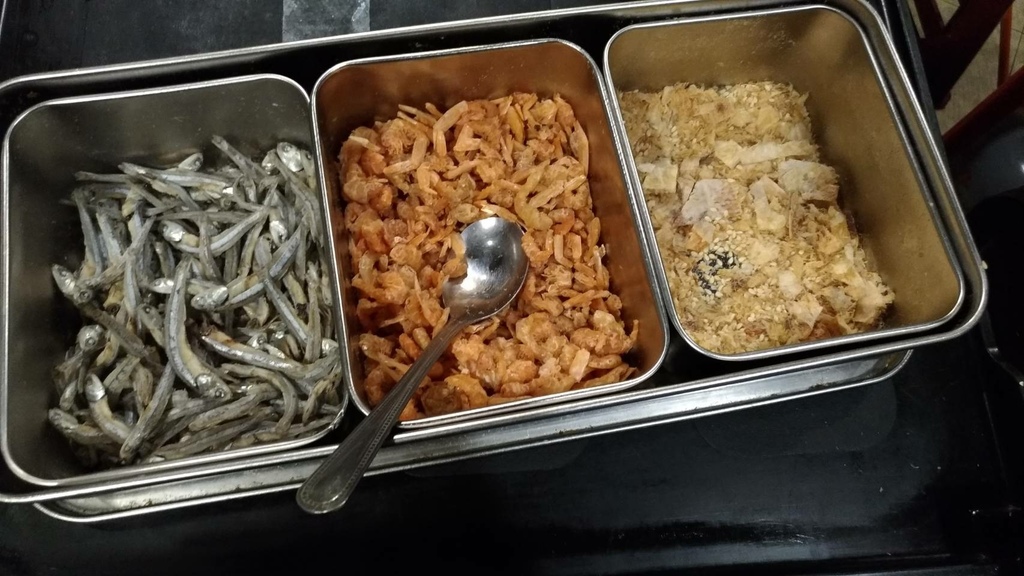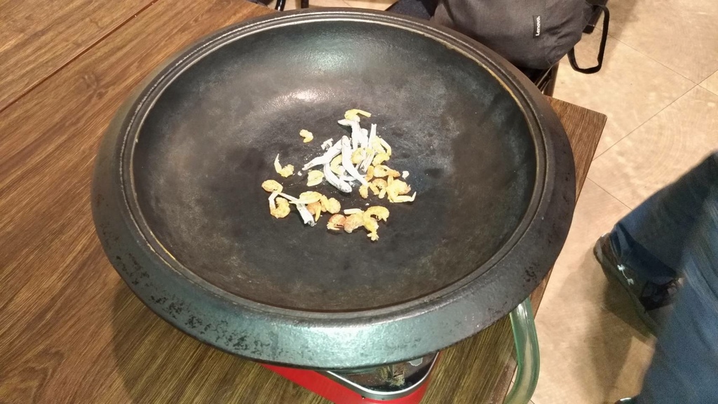 首先石頭火鍋會先放上沙丁魚乾與蝦米乾,須事前熱鍋兩分鐘再行爆香炒料的動作!