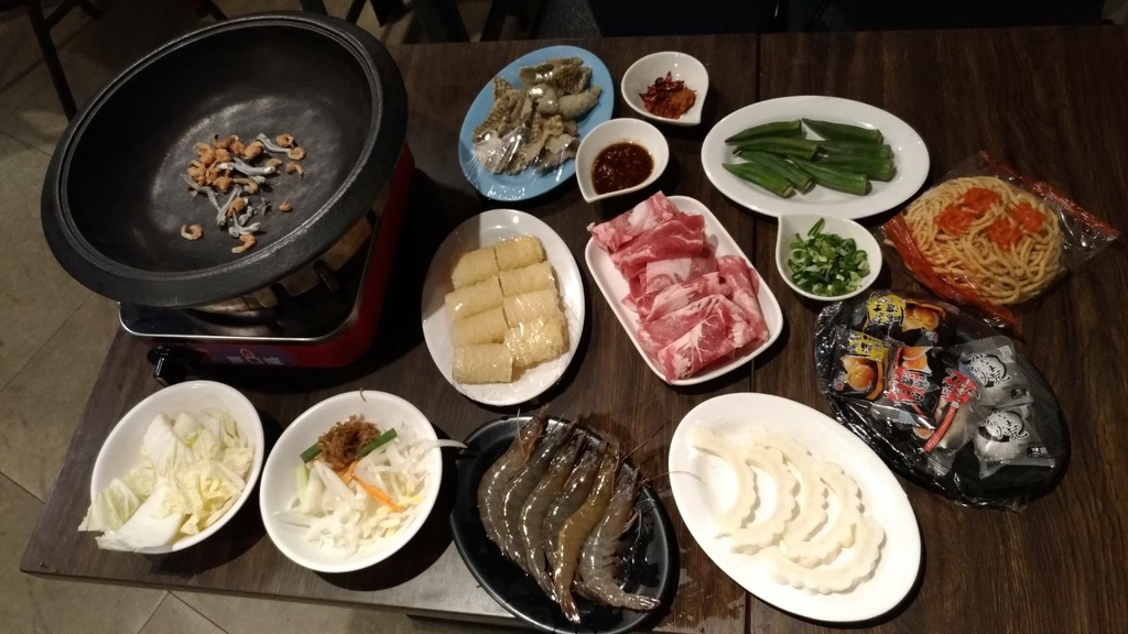 我點了羊五花、秋葵、鍋燒意麵、麻吉燒、白玉苦瓜、千張豆皮、白蝦、香港炸魚皮,一個人開心享受石頭火鍋就是這樣的隨意,一個人吃不多,基本配備就是照片左下方兩碗配料像是高麗菜及洋蔥等獨門配方香辛料,待會熱鍋2分鐘後,服務員就會過來進行爆香炒料的服務!