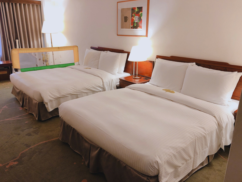 踏入房間就有種似曾相似的熟悉感,跟墾丁福華飯店的感覺很相像(看文章),古色古香的木質風格:) 房務人員也很貼心幫我們置放好床圍,晚上就不怕阿呈滾下床啦~