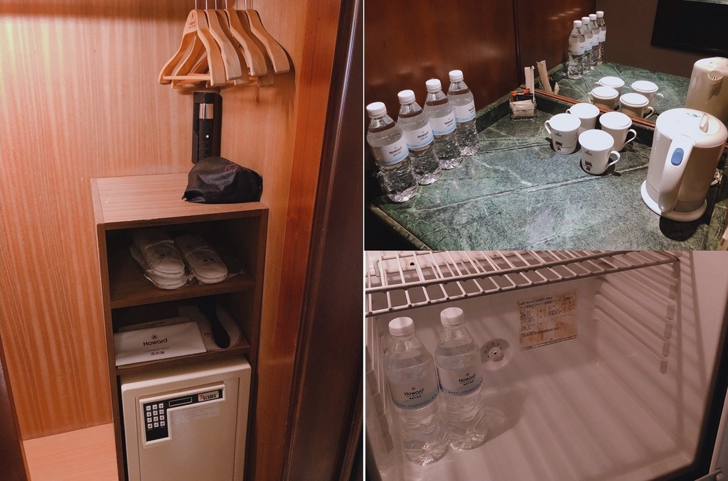 衣櫃內有衣架、吹風機、手電筒、拖鞋、洗衣袋、鞋拔、保險箱。另一側的平台有瓶水、茶包、咖啡、糖包、馬克杯、快煮壺。下方冰箱還有兩瓶水。