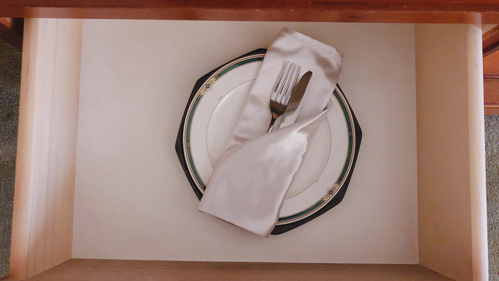 每次住飯店,兩隻寶就會開始到處找機關、找抽屜,看看有什麼新發現~ 電視櫃下方抽屜有一組餐具呢!晚上我們點了鹹酥雞剛好派上用場啦>///< 但通常都是拿來切迎賓水果的啦哈哈