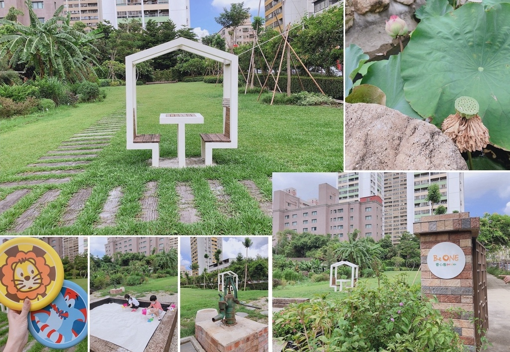 有一片大草皮,能玩玩飛盤:) 但天氣太熱了,我們只讓兩隻寶玩一下下沙子,這沙子其實是很小粒的石頭,很好清潔!媽媽們應該都很喜歡這種呵~ 旁邊還有古早時候的打水裝置,還能在蓮花池看到蓮蓬呢~