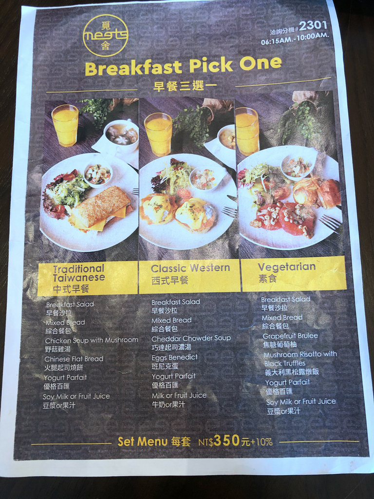 受到疫情影響,現在早餐不是自助式囉~ 是個人套餐的方式,中式/西式/素食三選一。我們選了中式跟素食的餐點,看到松露燉飯我眼睛都亮了起來>///<