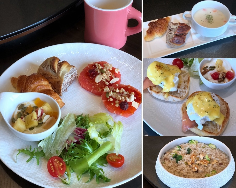 西式跟素食的餐點,都一樣有沙拉、優格百匯、兩種麵包。西式有班尼克蛋跟濃湯,素食則有黑松露燉飯跟焦糖葡萄柚。燉飯是粒粒分明的義式米飯,搭配堅果很好吃唷:) 焦糖葡萄柚也很美味,我只分到一小口,其他都被兒子吃掉了哈哈。若是想在房間內享用早餐,則是外帶餐盒,有貝果、馬芬、優格、飲料等等。