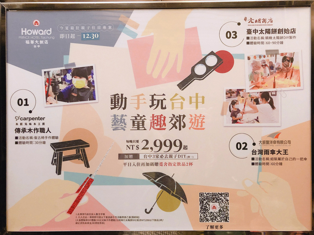 啦啦啦~ 這次來到台中玩耍!台中住哪裡呢?是親子飯店嗎?有沒有親子設施呢?這次的台中小旅行我們住在中港交流道附近的《福華大飯店》,搭配《動手玩台中》的套裝行程(活動到12/30),有含早餐及親子DIY活動唷!動手玩台中套裝行程