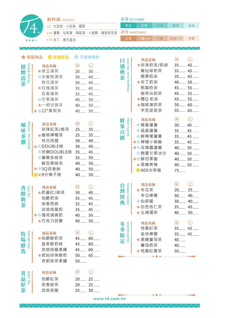T4清茶達人菜單(實際營業資訊依店家公告為主)