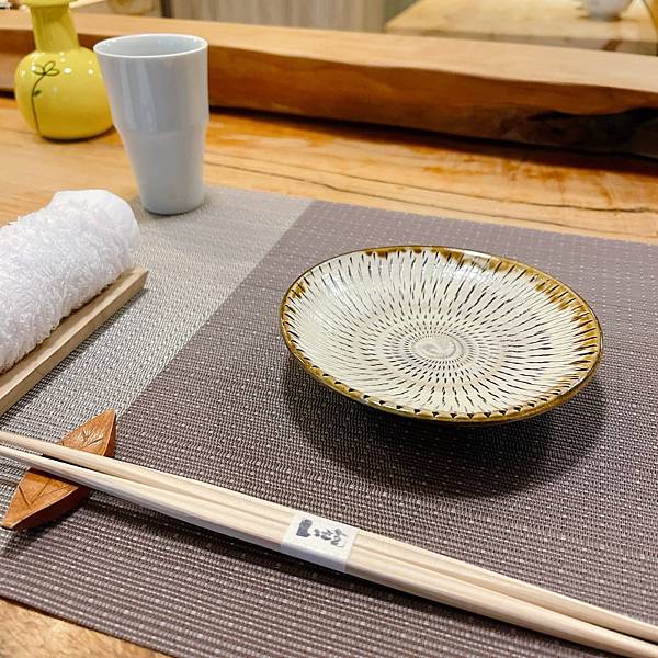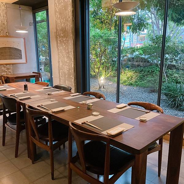 「いさぎISAGI」以前是美軍駐台時雙拼宿舍的其中一戶,後來也曾被當作畫室使用,後來再透過設計師將餐廳打造出新舊交融的寂靜美感,大量的使用原木建材及落地窗框,不僅對外投射出黃色調的光芒,用餐的客人也能看到窗外靜謐的庭院景緻。「いさぎISAGI」分為兩層樓,入門後右側是L型原木的板前區,入門左側則是可以容納八人的長桌,二樓則是適合2-4人的用餐環境,還有獨立式的小包廂,增添了一些用餐時的隱密性。
