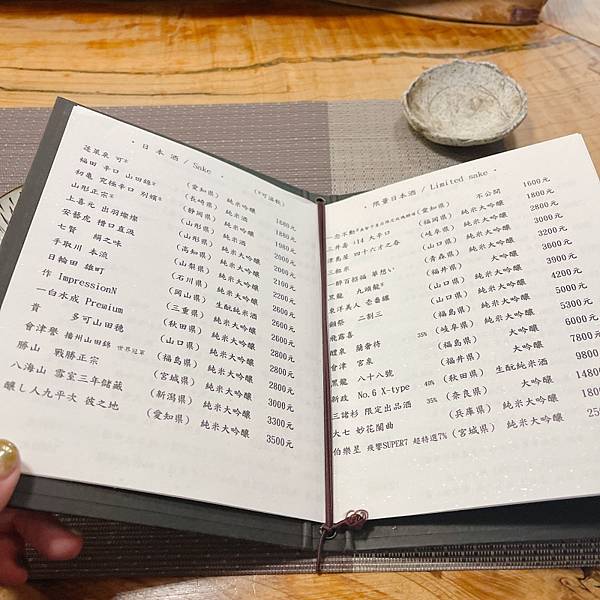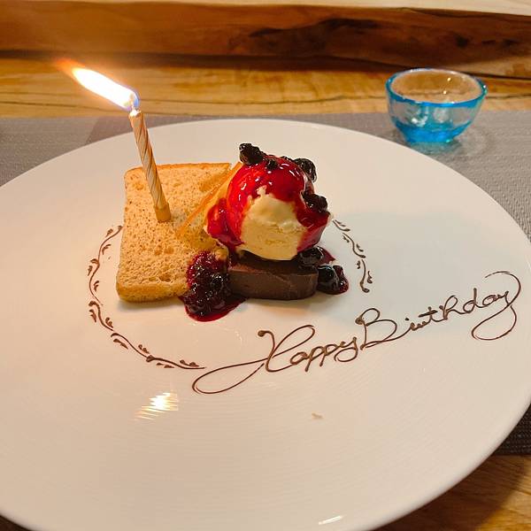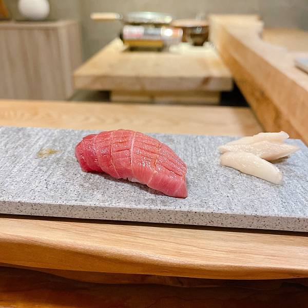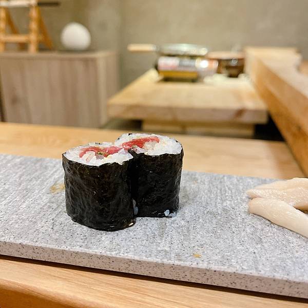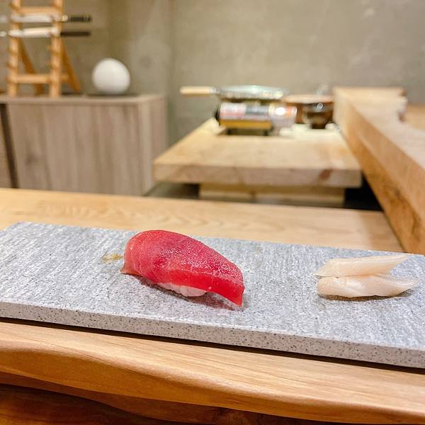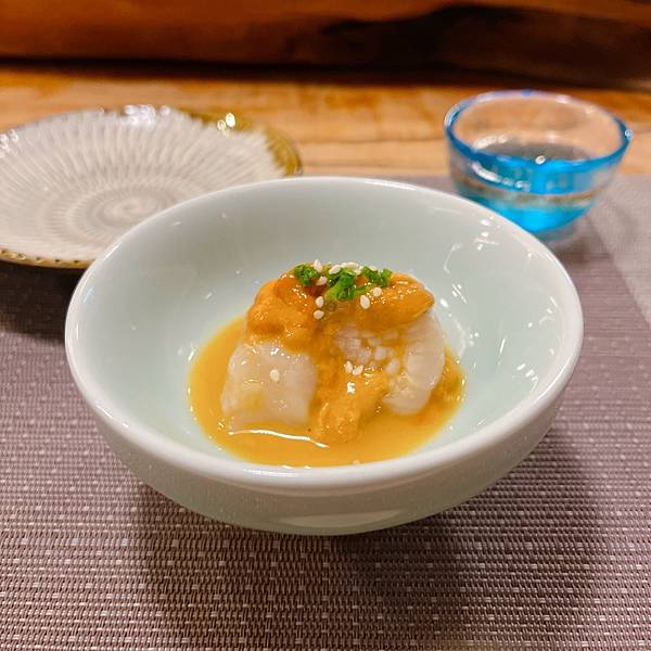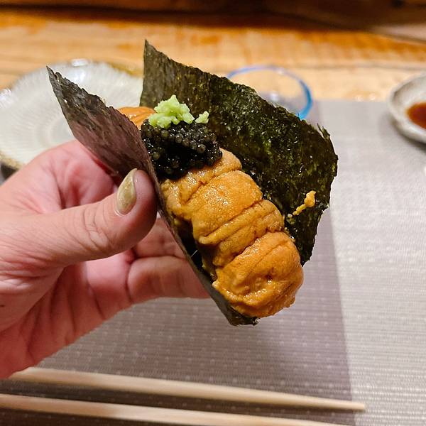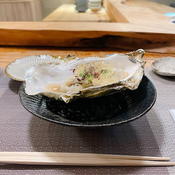 每一道菜主廚都會細心的調味,並且精選搭配食用的配菜,用充滿日式風格的器皿盛裝,北海道海膽醬佐干貝、肥美的生蠔切片上頭覆蓋清爽柚子醋果凍、日本海苔包裹整排海膽再點綴魚子醬、油脂豐富的炙燒鮪魚大腹、主廚經過多月細心醃製而成的日式烏魚子切片、鋪滿鮭魚卵的日式茶碗蒸,軟絲握壽司更是經過主廚細膩刀工切花後重新捲製而成,擁有不同一般的滑嫩口感。最後甜點是用葡萄柚果皮裝著的葡萄柚果凍,但由於壽星的甜點有特別的福利,店家招待主廚自製的戚風蛋糕搭配濃郁巧克力蛋糕佐豆漿冰淇淋。