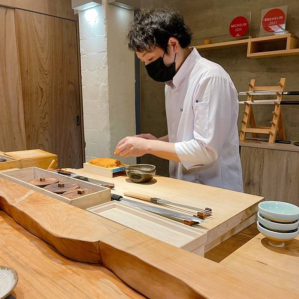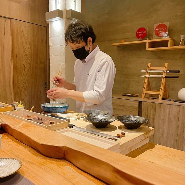 「いさぎISAGI」本店在日本福岡,存中街算是台灣唯一分店,主廚也是特別從福岡重金禮聘來的,背覆著身後2020、2021米其林餐盤推薦的榮譽,這位年紀輕輕的山野敬太郎主廚表現不凡。主廚在20歲開始,有5年在日本法國餐廳工作的經驗,因此除了日式料理外,法式餐點或甜點也都難不倒他。