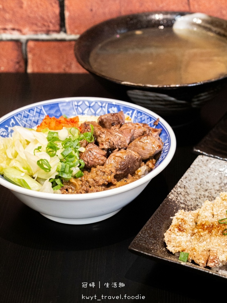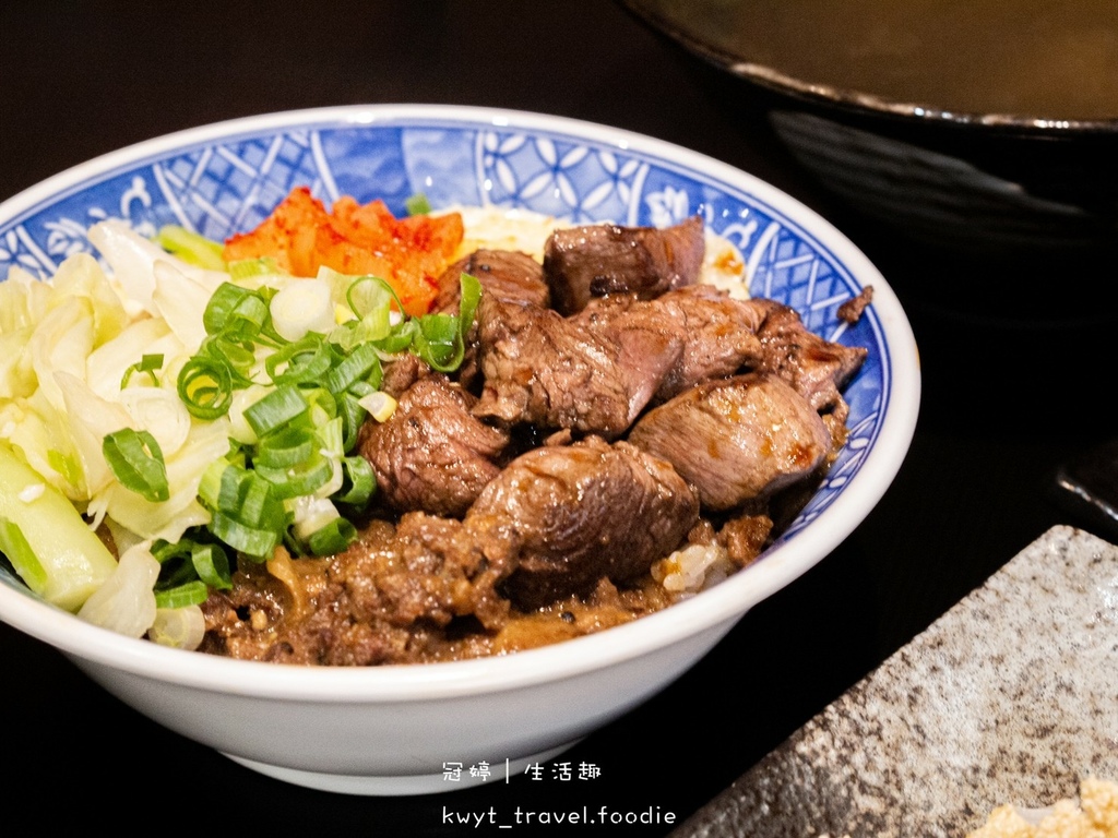 白米飯上鋪滿爆炒安格斯牛肉塊、滷香四溢的牛肉燥、銷魂系半熟蛋、香辣過癮韓式泡菜、甜脆高麗菜,最後撒上蔥花點綴得肉食系平價飯食就是這碗拉,完全可以感受到滿~滿~滿~的誠意。
