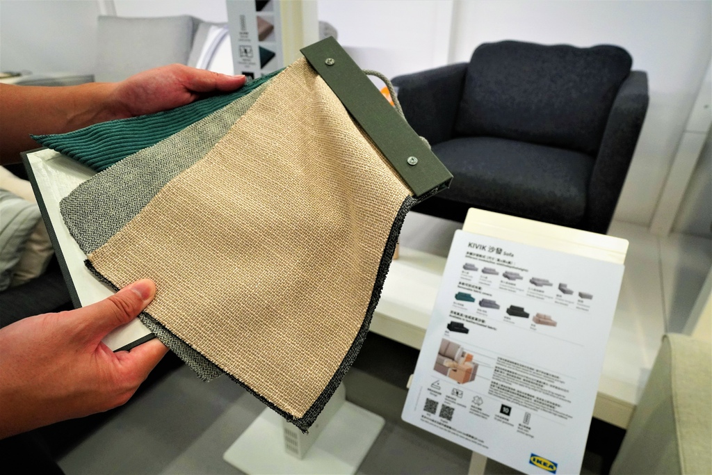 沙發旁也可以直接看到該組商品的材質、配色有那些可以選擇,而且實際的布料材質摸起來的觸感怎麼樣也都可以直接感受到,讚讚的。