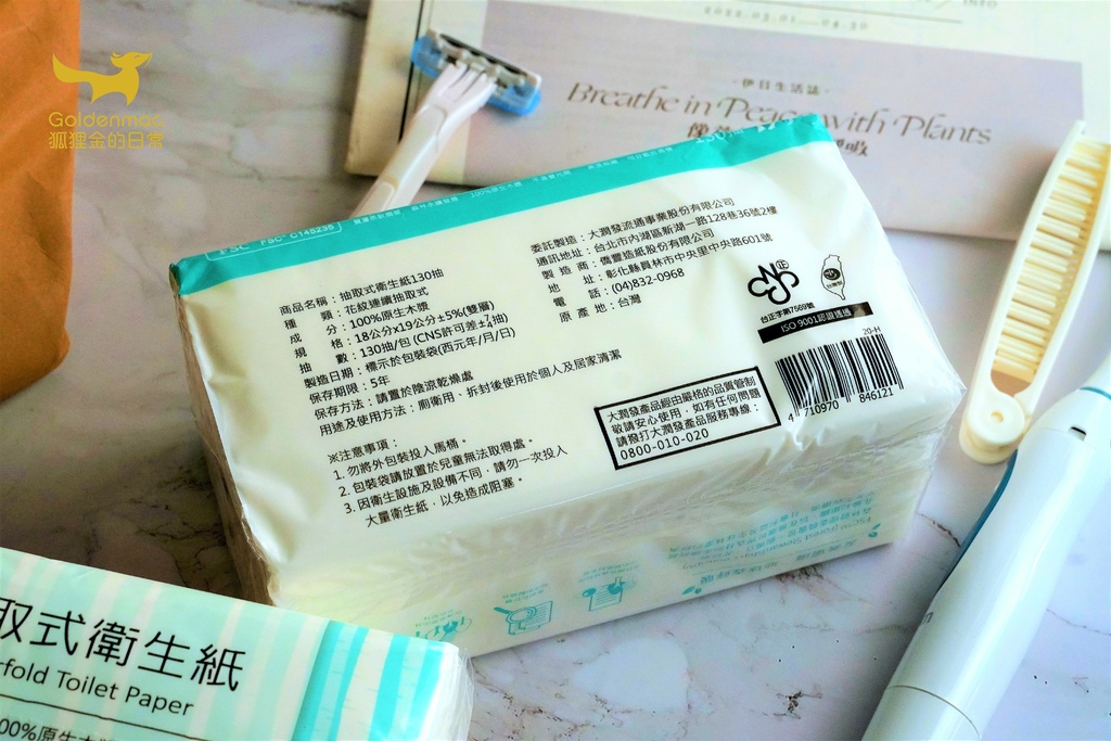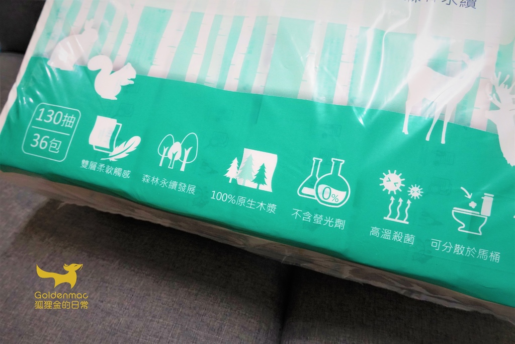 大姆指抽取式衛生紙在每個單包上頭也都有清楚的標示使用的是100%的原生木漿,而且他們「拒用熱帶雨林樹木」這點也是非常值得讚賞的。
