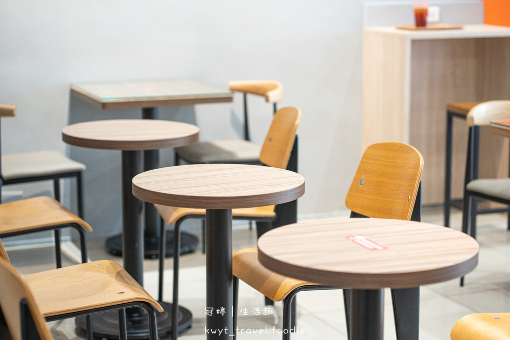 與店門口風格一致的用餐空間,選用質感白餐桌、同樣有著高質感的木製餐桌,與帶有軟式椅墊的木製椅子搭配。