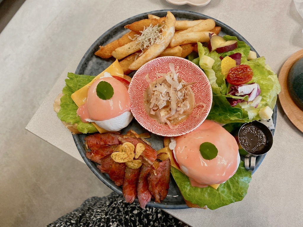 配餐自選的脆薯、胡麻豆腐,主食班尼迪克蛋、牛肉與沙拉,有菜有肉又有炸物點心,牛肉很嫩不會過於乾柴,吃的好滿足又超飽的
