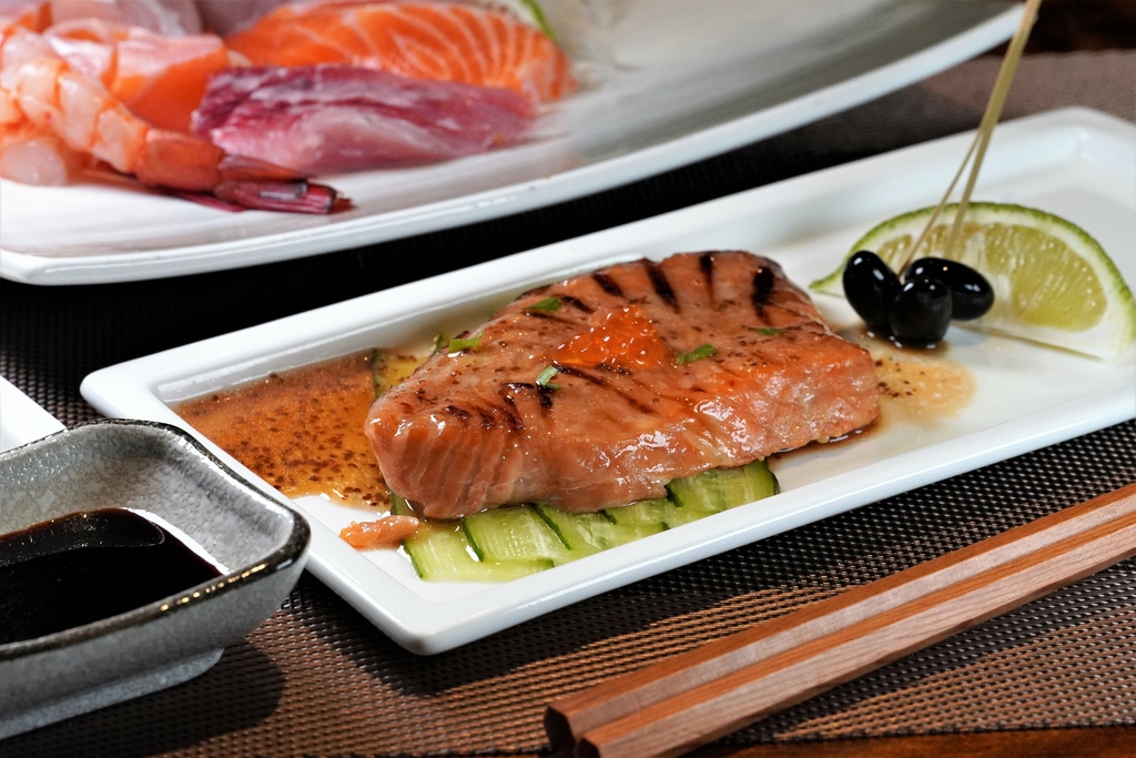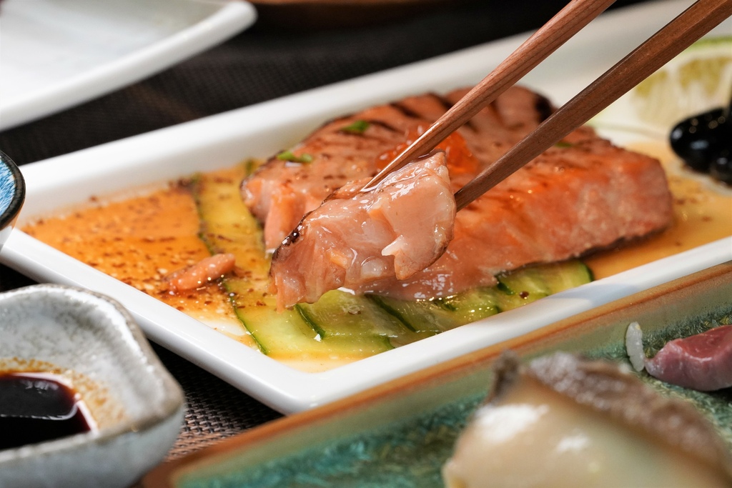 烤魚當然是吃日本料理一定要點的啦~旨味日式料理有烤魚下巴、時令鮮魚跟這款蜜汁鮭魚,有別於西京燒像這樣用和風醬汁料理的風味多了甘甜的滋味,魚肉本身烤到七分熟左右口感很細緻,再配著爽脆的黃瓜片一起吃非常美味。