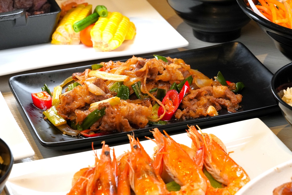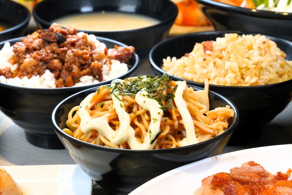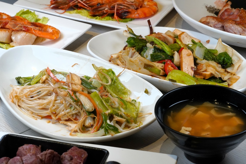 鐵砂掌新鐵板料理除了前面提到的蔬果自助吧區,另外一邊自助吧還有超多好料,冷熱飲品、湯品、炒飯、日式炒麵、滷肉飯…真的是太開心了吧!當然這些好料也一樣是「無限量供應吃到飽」。