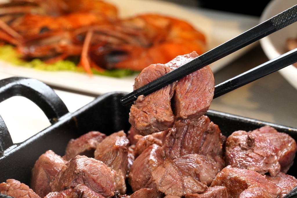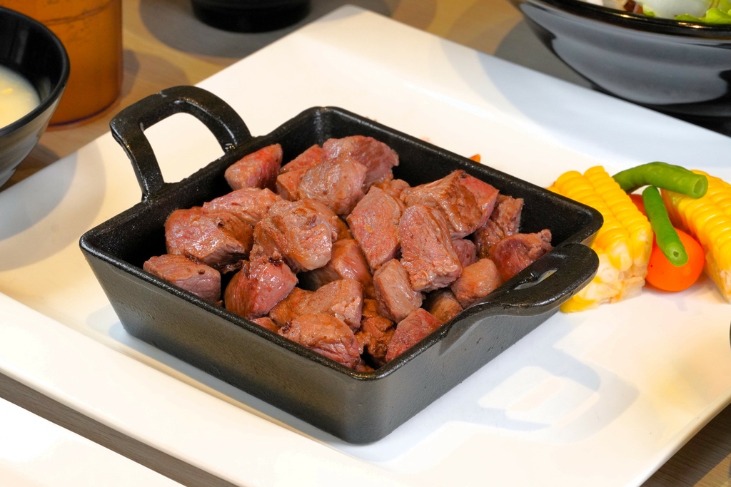 鉄砂掌新鐵板料理板腱牛排料理好上桌時師傅也已經協助切好這樣骰子狀一口一個剛剛好,跟海鮮一樣牛排沒有特別去調味他,可以自己搭配喜歡的醬來吃,除了胡椒跟玫瑰鹽之外,自助吧那裡也有蘑菇醬、黑楜椒醬、主廚秘醬…等配料可以選擇。