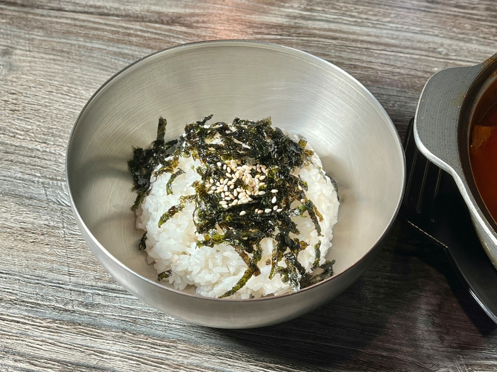 在加入海苔的飯上淋上豆腐鍋湯汁,濕潤帶有辣度的好滋味,變成湯泡飯超可口~