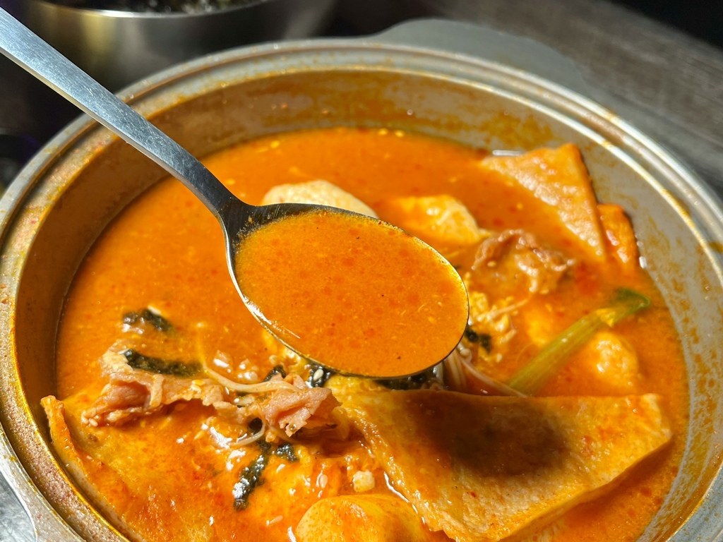 熱騰騰韓式豆腐鍋料超級多,蛋腸、貢丸、竹輪、魚板、肉片、韓式魚板通通有,軟嫩豆腐吸附韓式辣醬精華好好吃,淋點湯汁在飯上,辣度更能刺激味蕾,吃上一大鍋好幸福!
