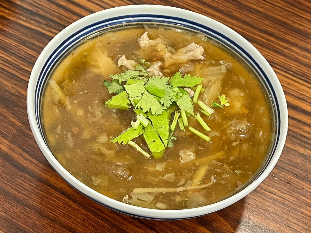 搭配古早味酸甜湯頭,相當開胃的調味,越喝越開胃,加上點辣椒跟黑醋,酸辣帶勁又能感受到肉羹紮實感,不論配飯配麵都很搭