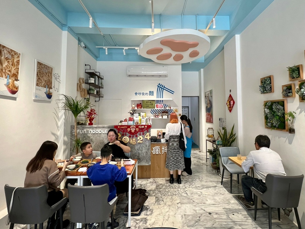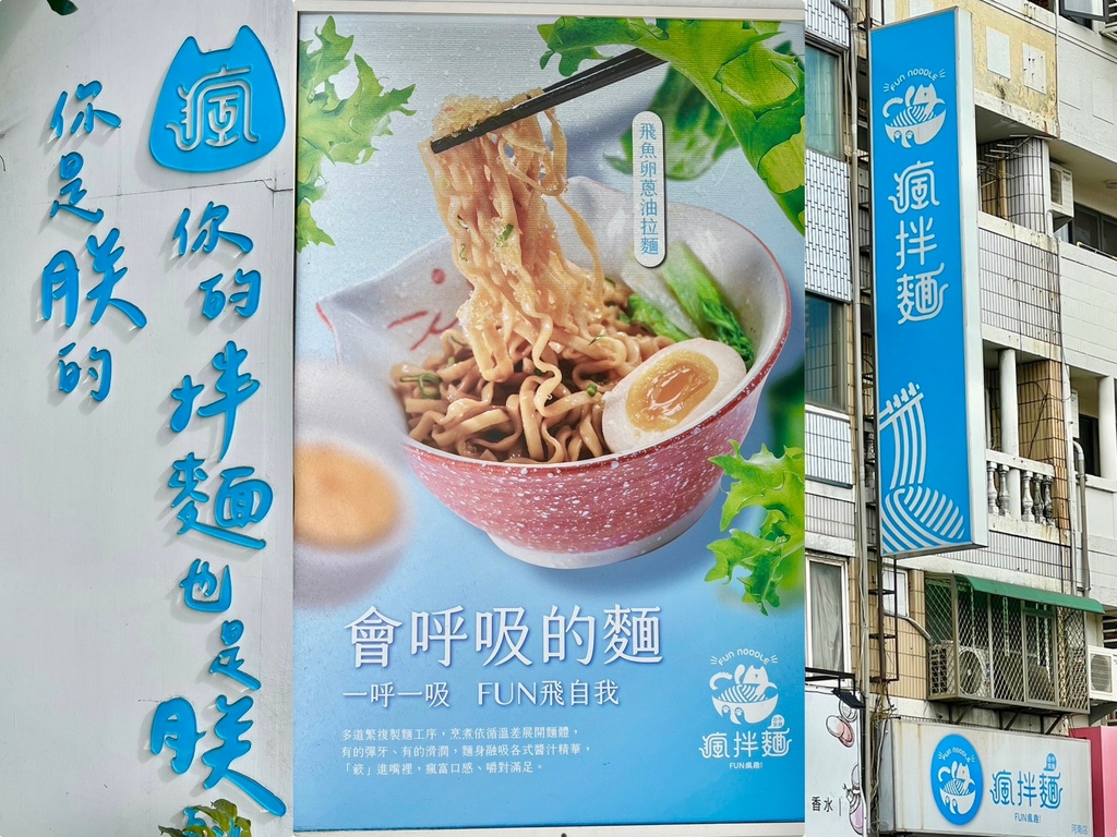 瘋拌麵採用天空藍的色調,外觀給我一整清新的感覺,呼應店內招牌的會呼吸的麵,有種無拘無束的自由感