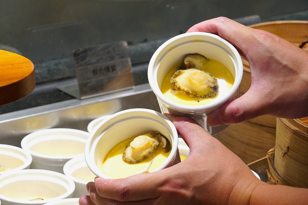 另外蒸籠區這裡也有多道經典的港式點心可以選擇,但一旁的「鮑魚茶碗蒸」立馬吸引了我的目光,整顆的鮑魚做成的茶碗蒸到底是有多豪邁~哈哈哈!這個也是超級人氣品項,而且也是假日限定的喲!Q彈的鮑魚配上滑嫩的蒸蛋,再加入了鮮菇去提出風味的層次,真的是要來個幾碗才過癮。