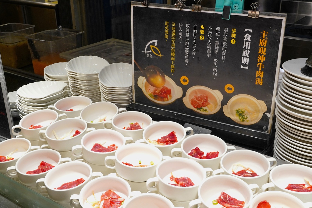 再來推薦大家來一定要喝上幾碗這現沖牛肉湯,主廚已經貼心的幫大家把肉跟配料以黃金比例配好,只需要淋上一旁的高湯就可以,端回到座位的時間剛好是最佳的品嚐時刻,記得趁熱喝喲~