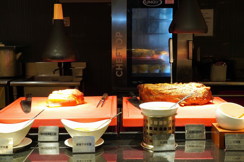 再來怎麼可能放過現切爐烤窩心沙朗牛排跟這爐烤煙燻圓大腿,想吃幾片就跟師傅說直接豪氣的切給你,一旁也有幾款不同的沾醬提供大家選擇,小金自己是很推薦大家可以來點玫瑰鹽去提出肉的鮮甜味就很讚了。