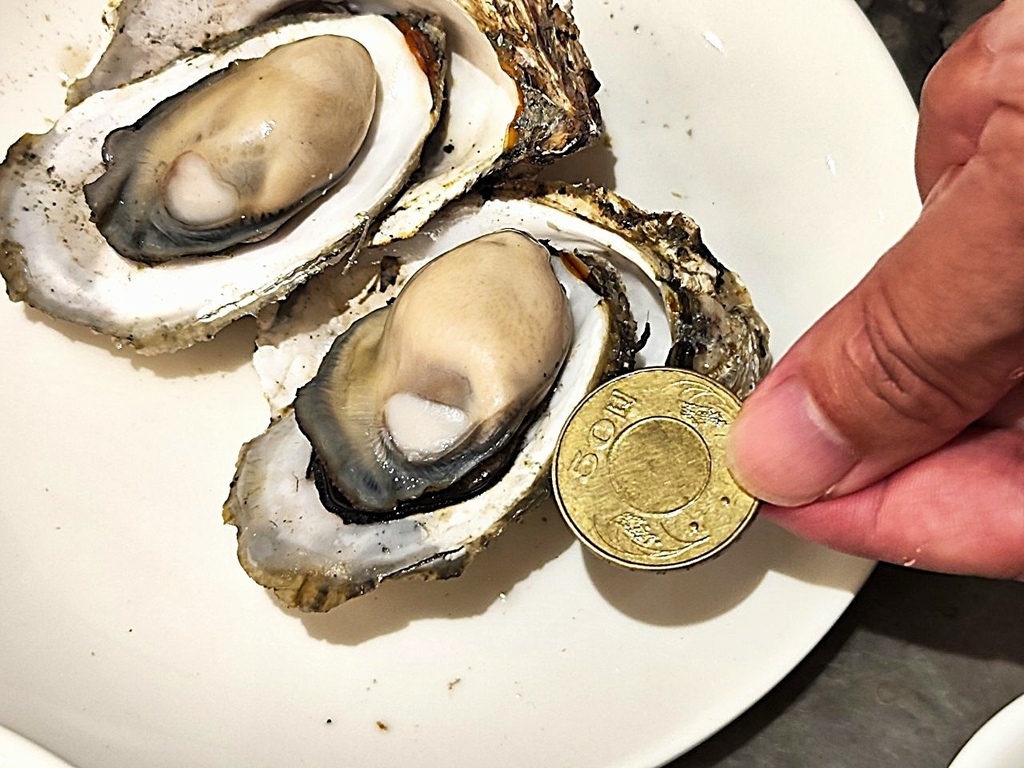 以為這樣就沒了嗎~那可太小看新天地樂食百匯了,這烤鮮蚵也是超級人氣料理之一,小金特別拿五十元銅板來給大家看一下這鮮蚵的size有多大顆,是不是真的很有誠意,他們提供的食材認真是沒在客氣的,就是要每個客人都吃的開心滿意。