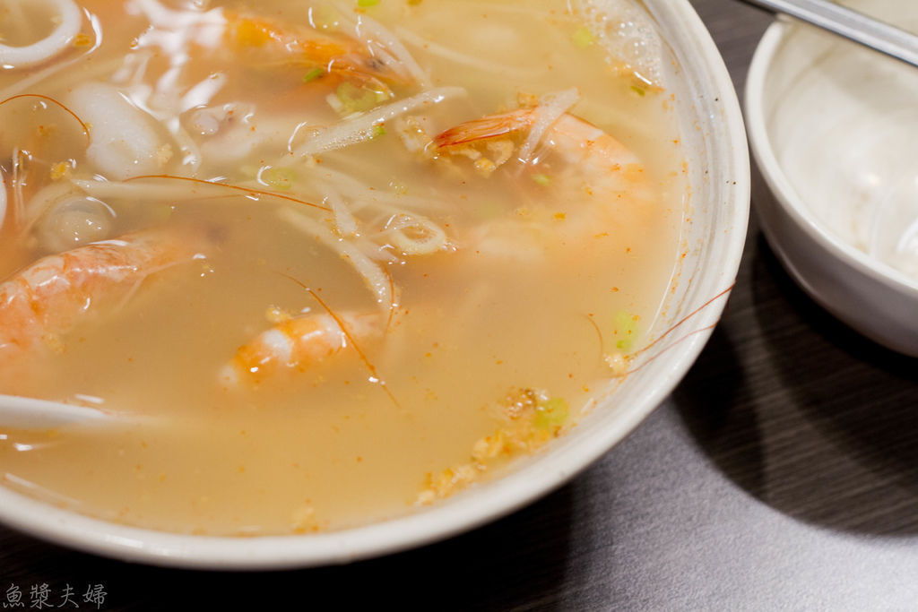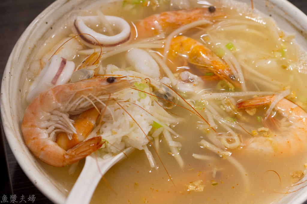 從碗面上一看好像看不出什麼來,只看到不少蝦子、透抽跟蛤蜊,連飯都沒看到。不過裡面的料倒是不少,實際一撈就會知道。這邊要說一下,湯的蒜頭味有點太重,蓋掉了海鮮本來的鮮甜,有點可惜。