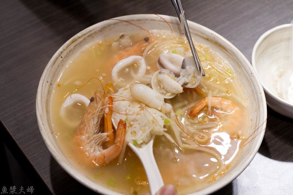 輕輕一撈,就能發現裡面的料不少。蛤蜊跟蝦子份量頗多,除此之外還有飽滿有彈性的鮮甜蟹腳,而很吃新鮮度的透抽,也是一樣鮮甜軟彈。