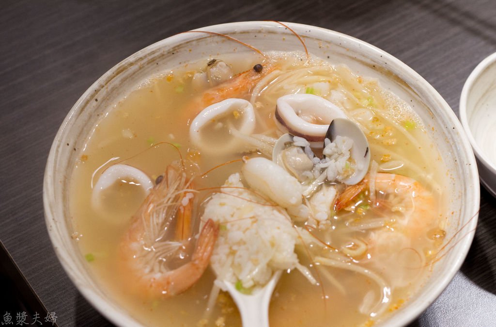 而拼鮮海產泡飯,主打一碗泡飯裡面有鮮蝦、蟹腳、帆立貝、鮑魚、透抽與蛤蜊。雖然價格稍高,一碗要175元,在彰化市裡面算是有點高價的店了。